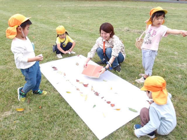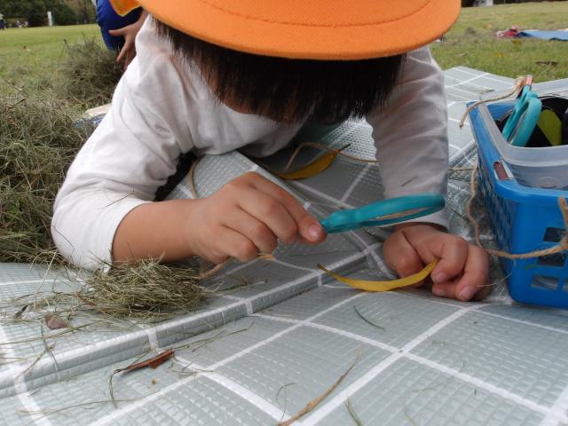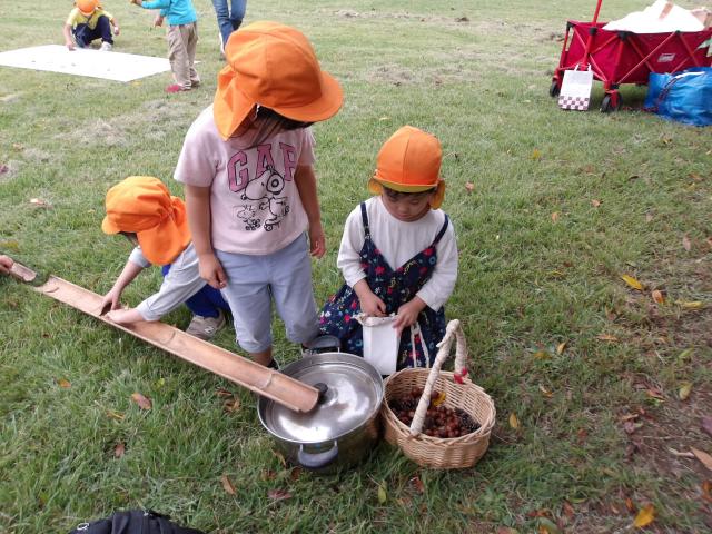子どもたちは、虫眼鏡を使って葉っぱや木の幹などをじっくり見たり、午前に集めたどんぐりを使って竹コースで転がしたり、色とりどりの葉っぱを集めたり、またお宝探しをしたり、気持ちの良い原っぱでのんびり絵本を読んだりと、思い思いに活動を楽しむ姿がありました。