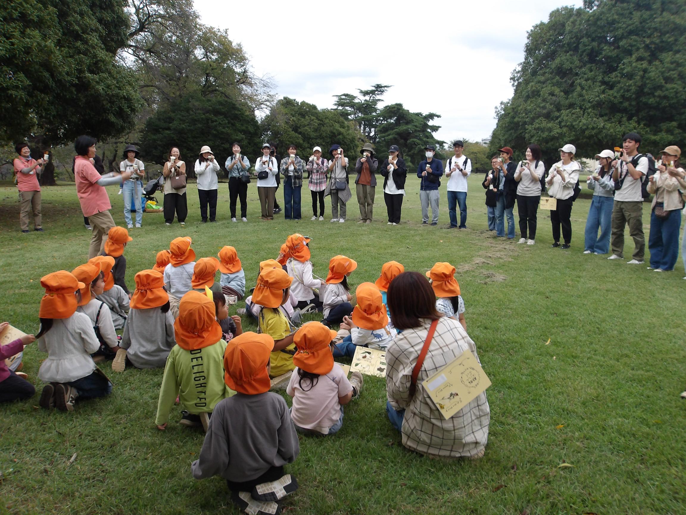 年中組の子どもたちも、大きなお友だちもまずは心と体を開放してから遠足をスタートしました!